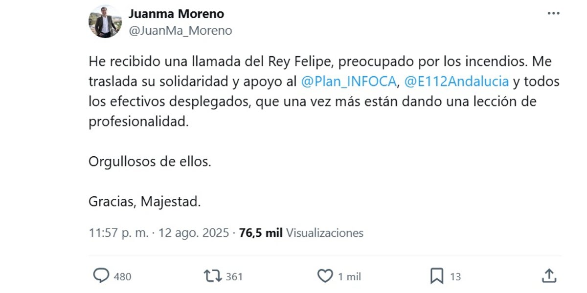 > «He recibido una llamada del Rey Felipe, preocupado por los incendios. Me traslada su solidaridad y apoyo al @Plan_INFOCA, @E112Andalucia y todos los efectivos desplegados, que una vez más están dando una lección de profesionalidad. Orgullosos de ellos. Gracias Majestad».